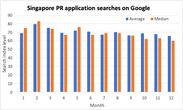 Using Google search trends of “Singapore PR applications” and “Singapore citizenship applications” as a proxy for lagged submissions we can make some judgements on when best to submit your application. Before continuing, we would like to note that we have made the assumption that final submissions will on average happen 1 month after the search of these keywords are done as people will still need to collate the appropriate documents before submitting to the ICA.