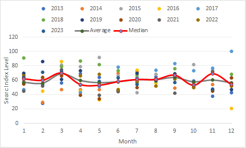 However, we would caveat that due to wide variability in the data in some months, or in geek speak the distribution is not normally distributed, our confidence level in making these conclusions during these months are weaker. We have shown this variability in the chart below with data points for each year plotted for each month along with the averages and medians. These months include the October, November, January, February, April and March as the difference between the average and median is quite large, implying a less normal or skewed distribution of data points. Therefore, assuming a 1 month lag for submissions then we are less confident about our conclusions for November, December, February, May and April. Similar adjustments to our conclusions to PR applications also need to be made.