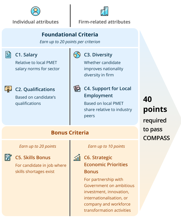 Note: Candidates who do not meet stage 1 (minimum salary criteria) will not be eligible for an EP, regardless of the points they would have scored under COMPASS. The 2-stage eligibility framework applies to new EP applications from 1 September 2023, and renewals of EPs expiring from 1 September 2024.