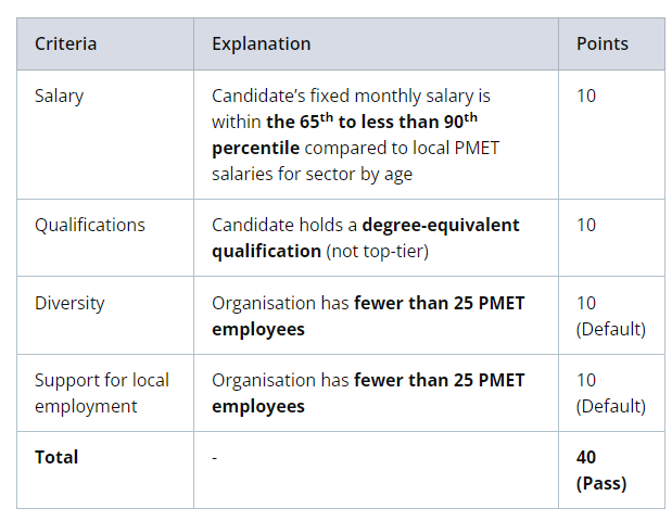 Candidate attributes: The candidate is an Operations Manager and holds a bachelor’s degree from a foreign university (not in the top-tier list). The candidate’s salary is at the 70th percentile compared to local PMET salaries in this sector.